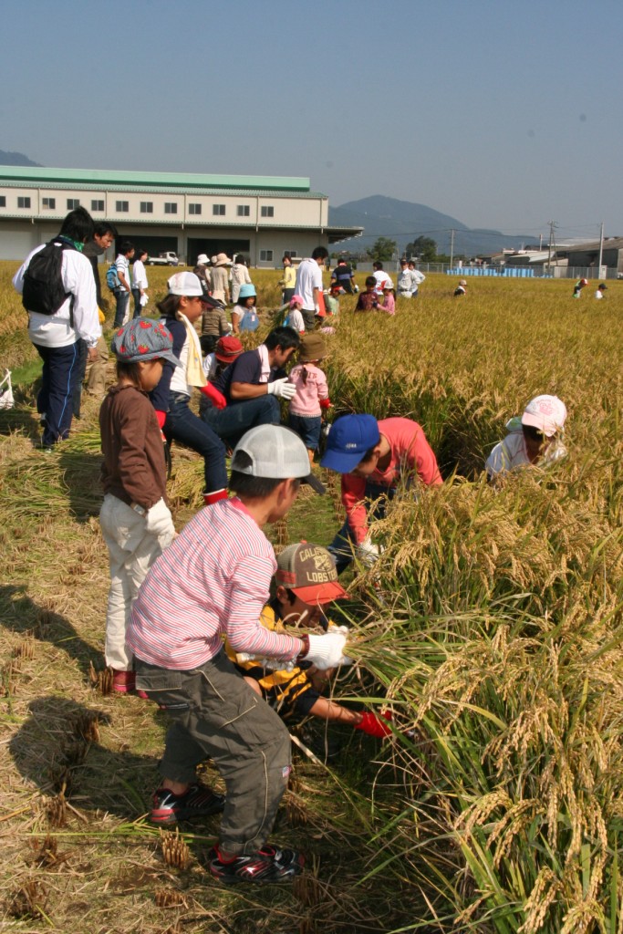 | 保護者が見守る中、「われ先に」と刈り取りを進めるスクール生 |