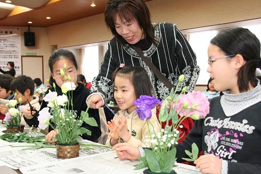 | 保護者と一緒にフラワーアレンジを楽しむスクール生ら |