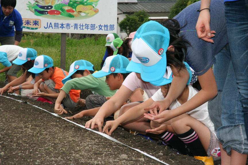 式後は、同市会富町のあぐりキッズ農園(約8アール)でカライモ苗の植え付けと二十日大根の種まきに挑戦しました。