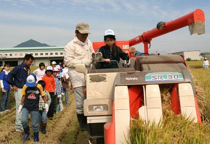 | コンバインに乗り稲刈りを楽しむスクール生 |