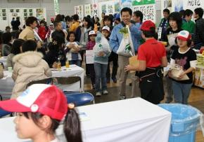 |  |  | 館内を“行商”してまわる子どもたち |  |  |  | 取れたての野菜いかがですかー。JA熊本市あぐりキッズスクールの児童52人が12月18、19の両日、同市本山町の興南会館で自分たちが収穫した野菜を地域住民らに即売しました。 JAが初めて開いた「夢未来農業祭2010」のイベントであぐりキッズコーナーを出店。消費者や地域住民に朝採り野菜を食べてもらおうと、スクール生らは早朝から同市会富町のあぐりキッズ農園に出向き、JA青壮年部の協力を得て栽培した野菜を収穫。袋に詰め合わせたダイコンやブロッコリー、スティックセニョールなどを特設テント内に並べました。