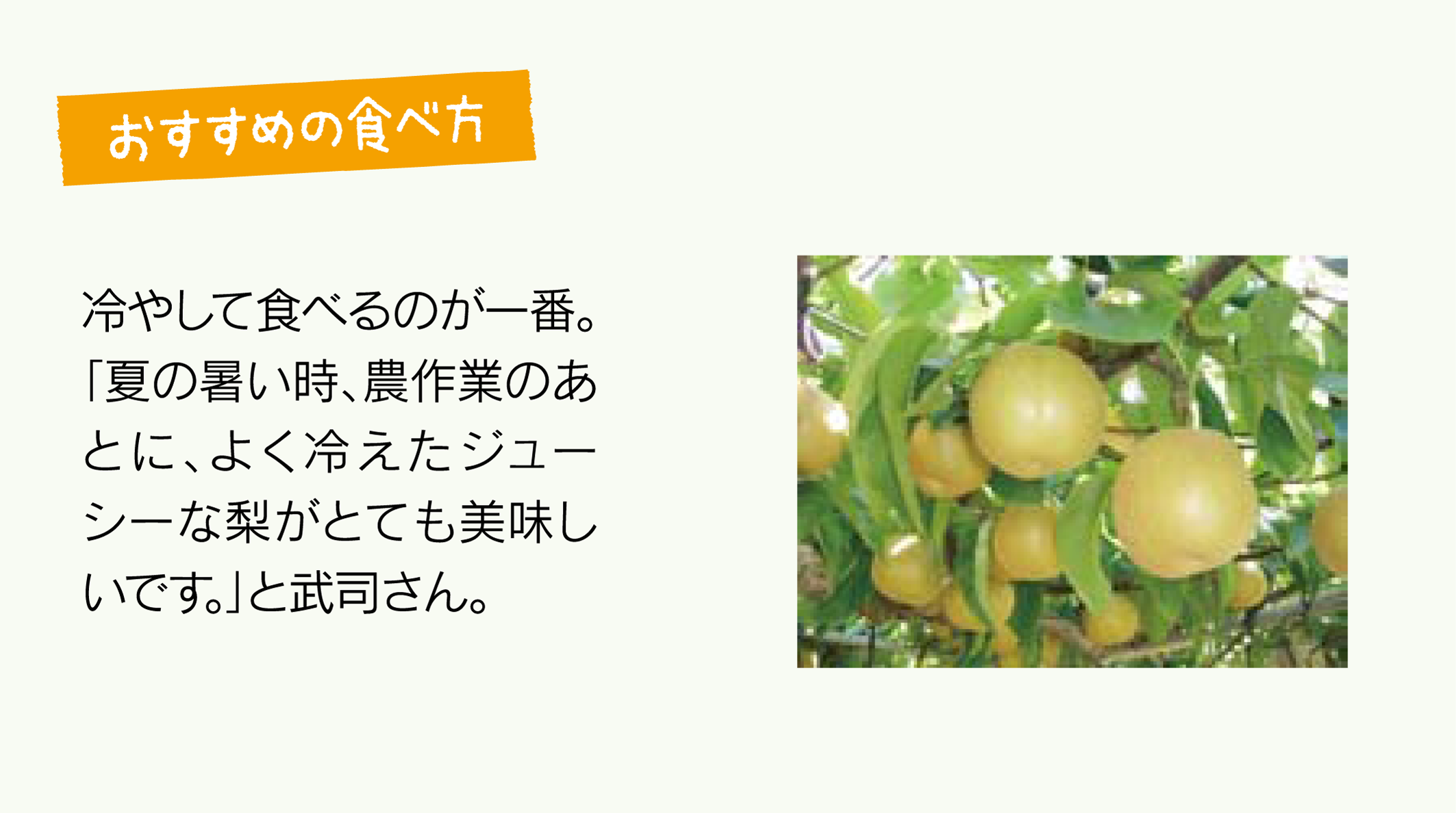 現在は、両親と3人で約45aの畑で5品種の梨を栽培しています。