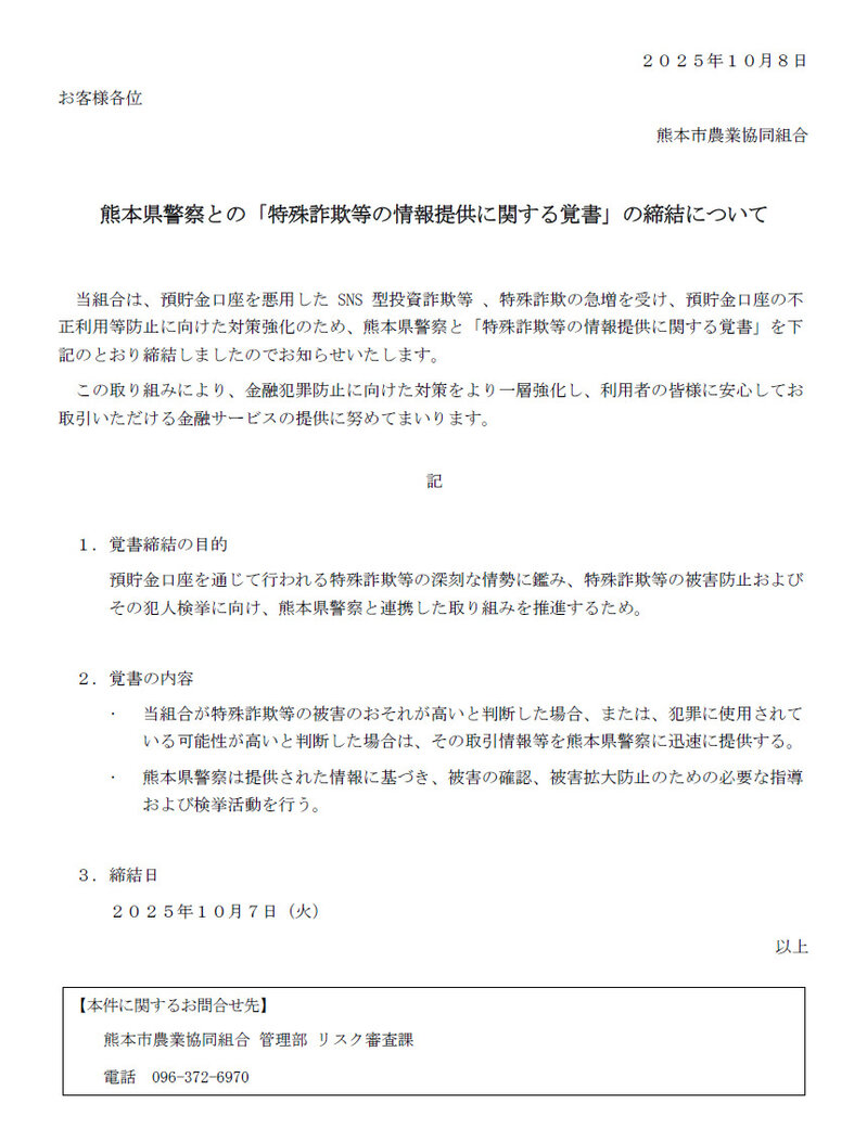 熊本県警との「特殊詐欺等の情報提供に関する覚書」の締結について