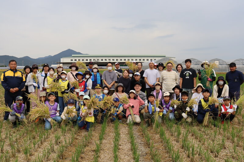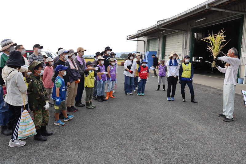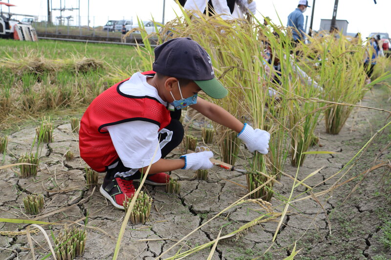 その後、飽田カントリーエレベーター近くの圃場に移動し稲刈りを体験!6月に自分たちで田植えし、立派に育った稲を親子で協力して刈り取りました。 |