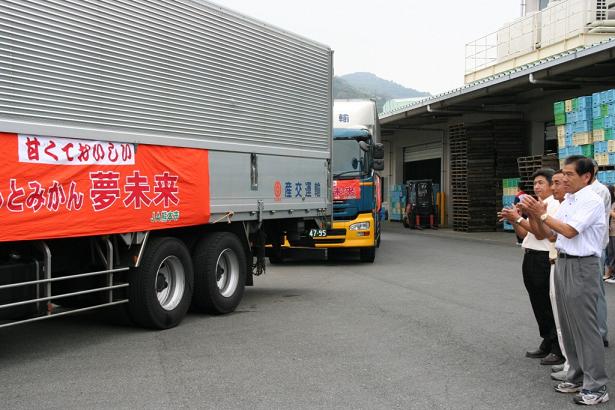 | 初荷を積んで出発するトラックを見送るJA柑橘部会役員ら |