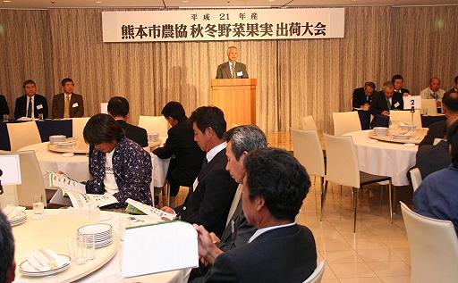熊本市農協園芸部会は10月20日、市内ホテルで平成21年産秋冬野菜・果実出荷大会を開きました。生産部会役員や県・市の関係機関、主要卸売市場30社、JAの指導・販売担当者ら81人が出席し、今後の販売対策などを協議しました。