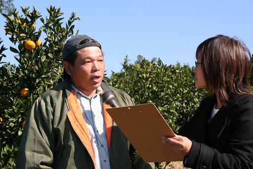 坂口さんはリポーターの質問に、「今年のミカンは糖度が高く、やや小玉だが味は最高」と話し、「高品質のおいしいミカンを作るために愛情を込めて育てている」などと、ラジオの聴取者へPRしました。
