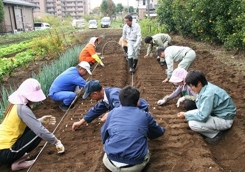 この日、女性部員らはニンニクの定植作業を体験。手始めに全員が鍬やスコップを握り、圃場の整備から取りかかりました。草を取り除き、畑全体を耕しながら堆肥40㌔を散布。管理機を利用して土壌とまぜ合わせ、土をフカフカの状態に仕上げました。日当りと水はけを良くするために畝立て(幅0.8㍍・長さ15㍍)にも取り組み、4つの畝の表面を平らにすると、ニンニク種(約5㌔)を15㌢間隔に手作業で植えていきました。