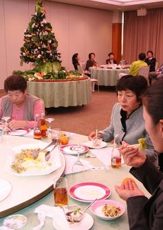 料理長が腕によりをかけた料理は、会員らが畑で栽培した秋野菜13品目のうち、ブロッコリーやシュンギク、ニンジンなど11種類を食材に使用。ホタテとホウレンソウのグラタンや大阿蘇鶏とジャガイモのクリーム煮など10品がコースで出されました。参加者らは「素材の味が生きていておいしい」「自分たちで作った野菜がおしゃれな料理になりうれしい」などと料理を堪能。タレントの大田黒浩一さんのトークショーも楽しみました。