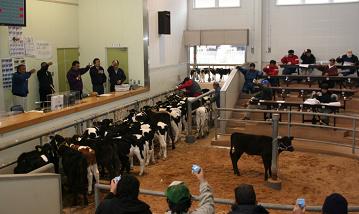 初競りにはホルスタインや交雑種、黒毛和種など120頭が上場。競りが始まる前には、詰め掛けた購買者らが市場内に繋留された家畜の成育状態やケガの有無、毛づやなどを入念に見定めていました。競り人の威勢の良い掛け声が場内に響き渡ると、子牛全頭が次々に競り落とされました。