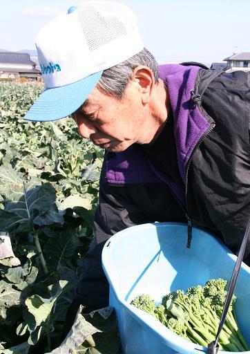 出荷ピークを迎えた1月24日、生産者は収穫作業に追われています。スティックセニョールは、ブロッコリーと同様に茎の頭に花らい(頂花らい)を付けますが、これを収穫するブロッコリーと異なり脇から育つ側花らいを収穫します。このため、生産者らは収穫前に頂花らいを取り除く摘芯作業も行います。