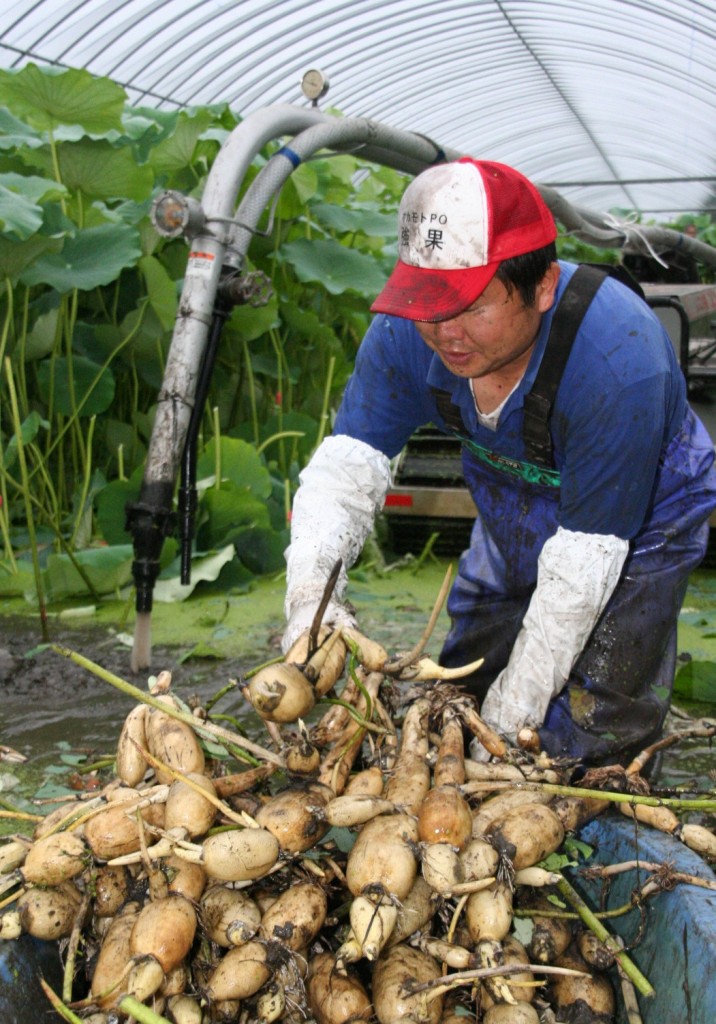 全農家がエコファーマーを取得している部会は、生産者30人が41ヘクタールで栽培。品質の高位平準化を図るため、堆肥を主体に減農薬栽培に努めています。あくが少なくさっくりとした歯ざわりが特徴の新レンコンは、JAで集荷し全量検査を行い、消費地の嗜好に合わせて「洗い」と「泥付き」の2種類に分けて出荷。国内で最も早く出荷できる新レンコンの産地です。