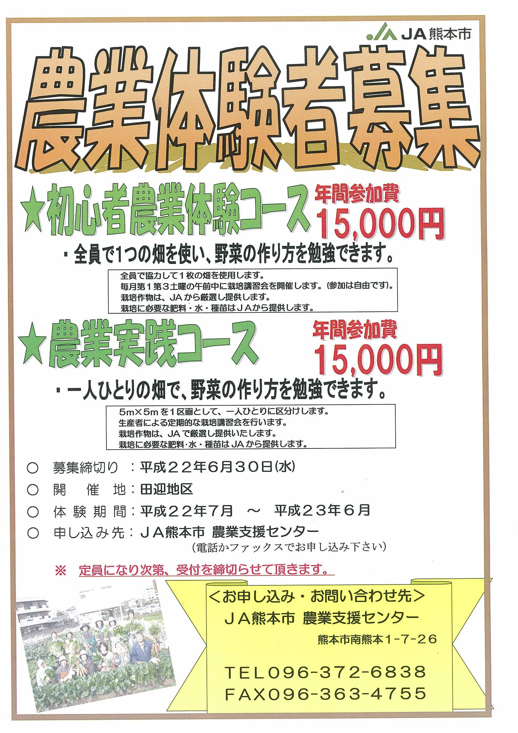 JA熊本市 農業支援センターでは、「いきいきふれあい体験農園」として、これから農業をしてみたい方、農業について学びたい方を募集します。