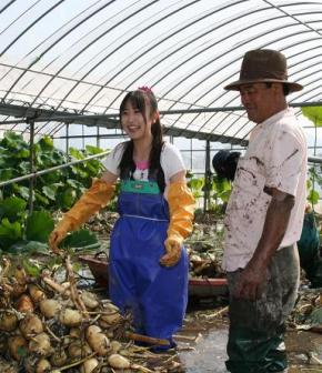 ビニールハウスで促成栽培する新レンコンの産地を、タレントの緒方仁深さんがリポーターとなり訪問。水かさが膝の辺りまであるハウス内では、右田部会長が掘り機の水圧を利用し浮き上がるレンコンを収穫。「レンコンは根と思われがちだが本当は茎。品質保持のため、節がつながったレンコンの先端部分の芽も一緒に収穫するのがポイント」と説明しPR。