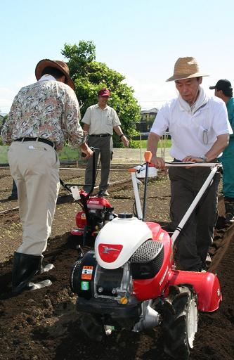 同組合とJA熊本市農業支援センターが技術指導。事前に整備していた270平方メートルの畑に、参加者全員で肥料を散布。小型管理機の実演指導もあり、機械やスコップを使い畝作りにも取り組みました。
