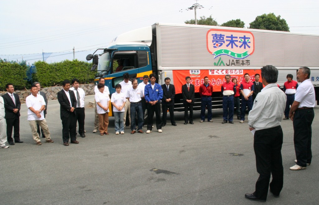 極早生温州ミカン「豊福早生」の初出荷に合わせて9月29日、熊本市河内町のJA熊本市夢未来柑橘選果場で出発式が行われました。10月1日の初売りに向け関東や関西など消費地に出発する大型トラック8台を、JA柑橘部会役員や県・市の関係機関、JA関係者ら約30人が拍手で見送りました。