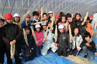 | 完成したわらつとを手にする子どもたちと大津社長(前列中央) |
