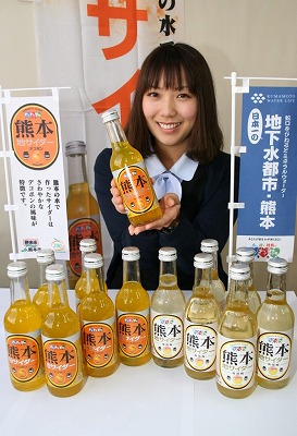 | 10日から販売を始めた「熊本地サイダーデコポン」、手前右は「熊本地サイダー南高梅」 |