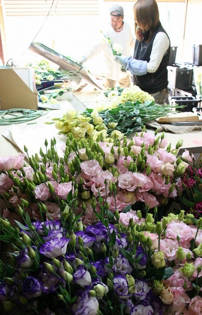 | 出荷のため花を選別する原口和大さん(奥)と由美さん夫婦 |