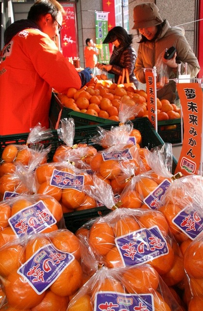 産地の生産者らが「私たちが作ったミカンです。どうぞ食べてみて」と買い物客に試食を勧めてPR。「夢の恵」を買った同市白山の主婦、黒崎富美子さん(46)は「ミカンの味が濃く、程よい酸味があっておいしい」と満足げ。同部会集荷企画部長の内田公明さん(52)は「今年の出来は日本一。『夢未来みかん』を地元の人たちに知ってもらい、消費拡大への応援者になってもらいたい」と話しました。