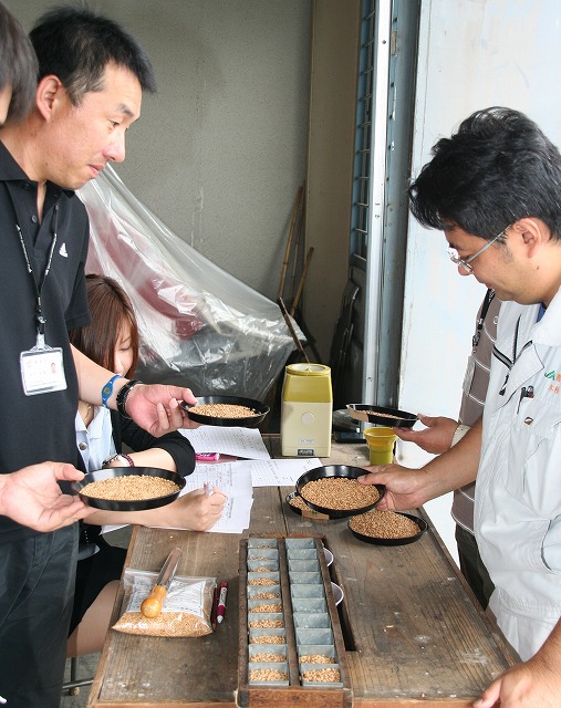 2012年産麦の検査が7月11日、熊本市のJA熊本市画図農業倉庫で始まりました。初日は南部及び画図支店管内の生産者が拠出した普通小麦943袋(1袋30キロ)の作柄を、JAの農産物検査員ら6人が分析。粒の形質・色などを見極めた結果、1等は約99%(942袋)で品質は上々です。