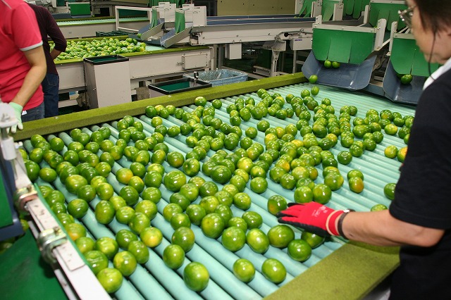 極早生温州ミカンの出荷が9月18日、熊本市西区河内町のJA熊本市夢未来柑橘選果場で始まりました。天候不順で開花が平年より約1週間遅れましたが、生産者の努力により果実品質は良好。20日の市場初売りに向けて選果した約30トンを関東の市場を中心に出荷しました。