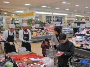 京都市のスーパー・イズミヤ(カナート洛北店)では、西村和洋会長と甲斐健太朗さんが「ナスとミニトマトのベーコンチーズ焼き」を調理。京都市の消費者にその場で味わってもらい、熊本市産の野菜の栄養と魅力を伝えました。