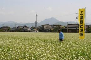 今年は3〜4月の寒の戻りで背が低かったが生育は順調。同地区は有明海に面した海岸沿いの地区で、温暖な気候が春ソバ栽培に適しています。乙畠営農組合が水稲作付け前の休耕田を有効利用し、春ソバ「春のいぶき」を栽培。栽培面積は6㌶で、収量は4000㌔を見込みます。