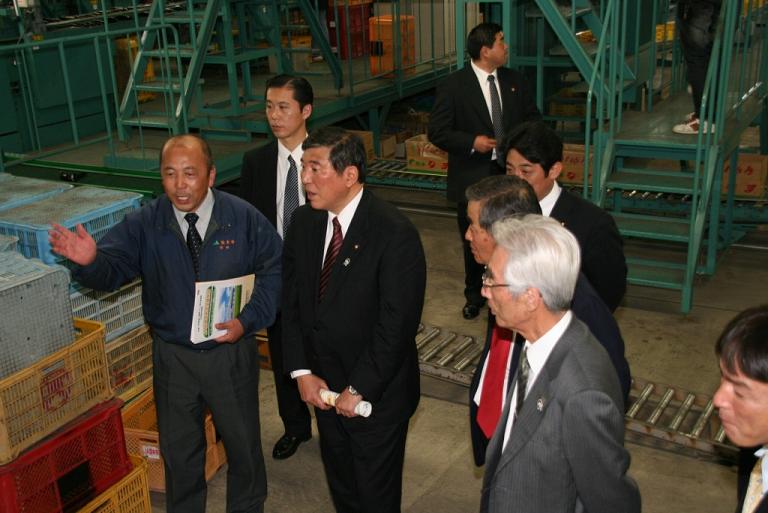 農畜産物の価格低迷や生産資材の高騰など農業を取り巻く環境は厳しい中、石破茂農林水産大臣が4月11日、会富町のJA熊本市野菜選果施設と河内町のJA熊本市夢未来柑橘選果場を視察に訪れました。自民党第二選挙区支部と熊本県農業者政治連盟熊本市支部の主催で、地元選出の林田彪衆院議員や野田毅衆院議員らも駆けつけました。