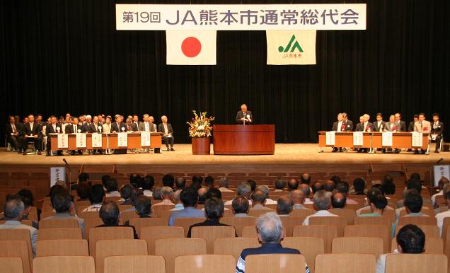 JA熊本市は6月16日、第19回通常総代会を同市の崇城大学市民ホール(熊本市民会館)で開きました。総代534人(書面議決含む)が出席し、平成21年度事業報告や22年度事業計画、JA活動総合3カ年計画など7議案を可決、承認しました。