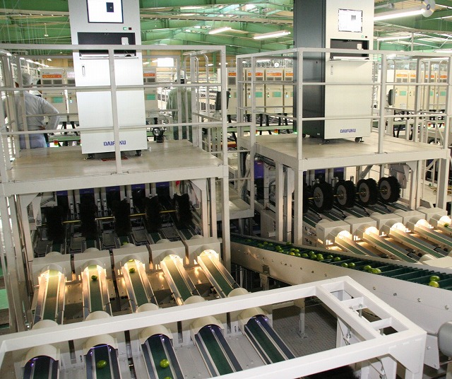 施設は、既存の鉄骨3階建てに計約2600平方メートルを増設。ミカンを電動リフトで下ろす自動荷受設備や、衝撃から守り採れたての品質を保持する「スローダウン式」フィンガーソーターのほか、箱詰め時にミカンに傷みを与えないスイング式自動秤量機や世界初の生キズセンサーを採用。品質を判定するより精密なカラーグレーダーと内部品質センサーも新たに導入しました。ミカンの選果・計測能力は日量約260トンで、総事業費約20億4400万円。
