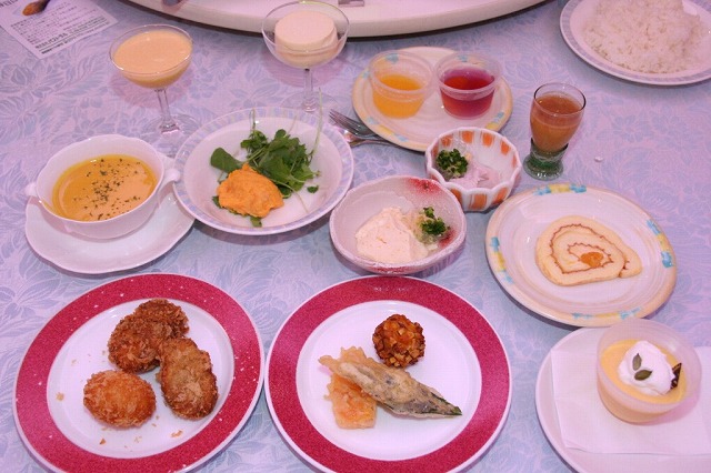 「春日ぼうぶら」は粉末やペースト状にして料理に活用。クリームスープやサラダをはじめ、コロッケや豆腐、米粉と配合したロールケーキや豆乳で作るプリン、アイスクリームなど多彩なメニュー15品がテーブルを彩りました。試作品は県内の食品加工業者ら5社が考案しました。