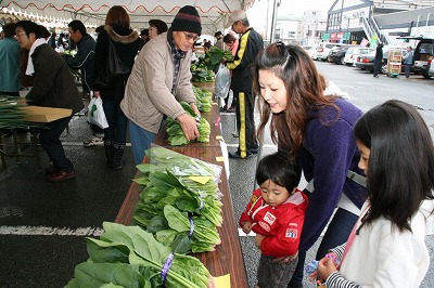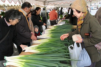 恒例の即売会では生産者が消費者に直接応対。食味や保存法など顧客の質問に答えながら販売し、取れたての農産物は飛ぶように売れていました。初めて訪れた近くの主婦は「どの農産物も安くて新鮮。作った人と話ができ安心感がある」と話していました。