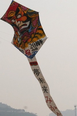 子どもたちは「将来の夢」や熊本ゆかりの武将「加藤清正の虎退治」などをテーマに凧を制作。最も大きい凧はたたみ約10畳分の大きさがあり、えとの兎にちなんだ物など大凧6基のほか、小凧をつなぎ合わせた連凧2基が海風に乗り大空を舞いました。清正を描いた河内中2年の生徒たちは「表情や色使いに苦心した自信作が空高く揚がり嬉しい」と喜んでいました。