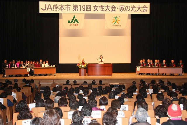 JA熊本市女性部は2月9日、第19回女性大会・家の光大会を市内で開き、「仲間とともに くらしと農業の未来を照らそう」などの大会スローガンを採択しました。女性部員はじめ行政やJA関係者ら約1200人が参加。女性部長が学校給食への手作りみその供給や食農教育、市産農産物の消費拡大に向けた「地産地消フェア」など活動報告と、継続への協力を呼び掛けました。