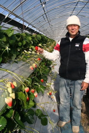 JA熊本市白浜苺部会は、18戸の農家が約6㌶で「紅ほっぺ」と「さがほのか」を栽培。作業の効率化と有利販売を図るため3年前から2品種に集約しています。