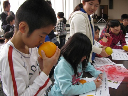 担任職員による「ちゃぐりん」の時間ではキャベツとミカンについてクイズ形式で学習。ミカン当てクイズでは、児童らは9種類の柑橘類を直接手に取り色や匂いの違いを比較しました。職員は「風邪予防にミカンを食べて、元気に冬をすごしましょう」と呼び掛けました。