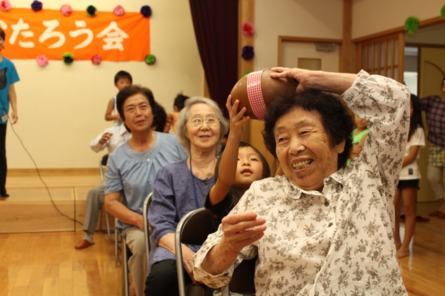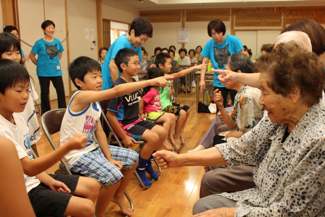 JA熊本市助け合いの会塩屋かたろう会は7月23日、塩屋公民館で地域の子どもたちと交流を深めました。子育て支援の一環で、夏休みに入った子どもたちと会員ら総勢80人が、レクレーションやアトラクションで交流を深めました。ボールゲームでは2チームに分かれてボールの受け渡しの速さを競い、ジャンケンゲームでは会員が勝つと子どもたちは肩たたきをしていました。桝永朋子会長は「地域のつながりが深まるよう、子どもたちと高齢者が一緒に活動できる機会をつくるのは大事。家庭での会話のきっかけが生まれれば嬉しい」と話します。