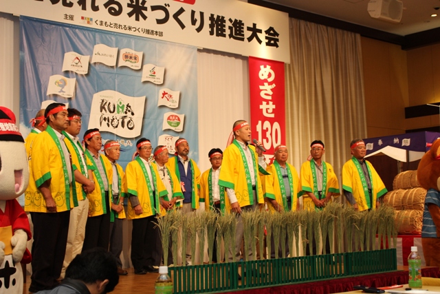 梅田穰本部長が「平成25年産米の食味ランキングで『森のくまさん』、『ヒノヒカリ』、『くまさんの力』3品種が特Aを獲得し、全国で高い評価を得た。26年産についても、JAグループ熊本が一体となってPRに取り組んでいく」とあいさつ。県下各JAの代表者が集荷目標を決意表明し、JA熊本市からはJA熊本市普通作部会の出田明人部会長が8万3000俵の集荷目標を宣言しました。
