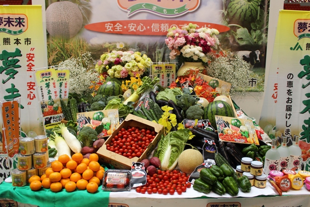 会場では、熊本市産の農畜産物や加工品の試食販売や、28支店が13グループに分かれて出し物を出店しました。主要9品目(ミカン、メロン、ナス、トマト、ミニトマト、ピーマン、牛肉、牛乳、米)を生産者が自ら消費者にPR。ステージイベントでは農産物を紹介し、来場者とジャンケンをして農産物をプレゼントしました。