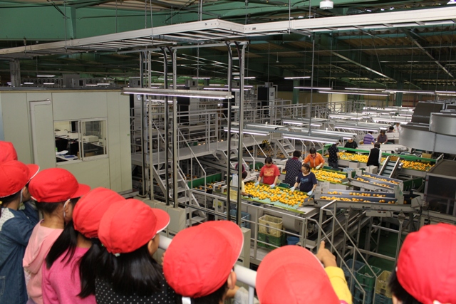JA熊本市夢未来柑橘選果場は毎年、ミカンの選果量がピークになる10月中旬から11月末まで、小中学生の見学受け入れを行っています。食育を目的に取り組んでおり、毎年約6500人(約80校)の児童が訪れます。熊本市は全国でも有数のミカン生産地。子どもたちはミカン畑に囲まれた選果場を訪れ、市の農産物について理解を深めています。