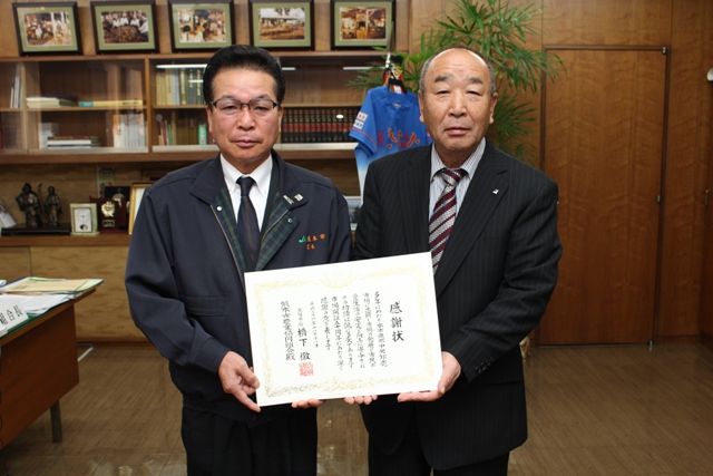 東果大阪の副社長(右)から賞状を受け取った宮本組合長(左)