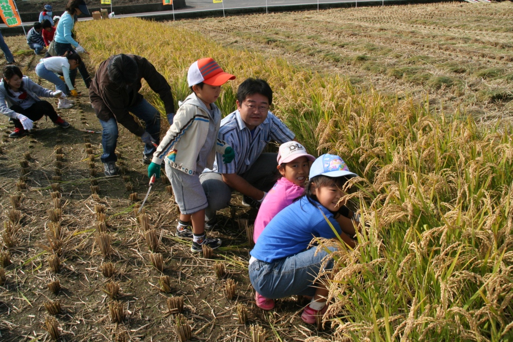 JA熊本市は農作業体験を通して農業や食の大切さを学んでもらおうと10月20日会富町であぐりスクールの児童と保護者10組21人が参加して稲刈り体験学習を実施しました。