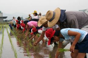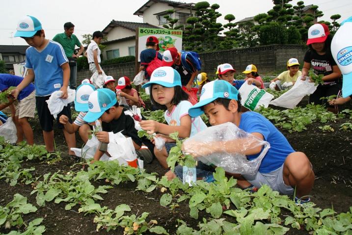 JA熊本市は6月27日、農業や食の大切さを学んでもらうあぐりキッズスクールを開き、児童51人が田植えと二十日ダイコンの収穫、スイートコーンの種まきを体験しました。
