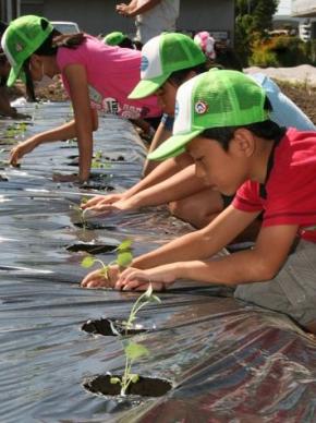 スクール生らは同市会富町のあぐりキッズ農園(8㌃)で、ブロッコリー苗の植え付けに挑戦。事前に畝を作ってかぶせてあったマルチシートに穴をあけ、JA青壮年部や職員の指導を受けながら葉が土に埋まらないように丁寧に植えつけました。約2カ月後の収穫を楽しみに、畑にはミニニンジン、ホウレンソウ、ダイコンの種もまきました。