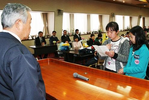 スクール生を代表し市立日吉小5年の高村明里さんと同日吉東小4年の柴田万里亜さんが「お米や野菜作りなどを体験し、農業や食べ物の大切さを学んだ。これからは食べ物を残さず、自然の恵みに感謝していただきたい」と謝辞を述べました。