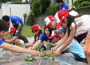 式後は、同市会富町のあぐりキッズ農園(約8アール)でカライモ苗の植え付けと二十日大根の種まきに挑戦しました。