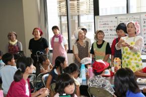 スクール生らは同市秋津産の大豆を使って麦みそ造りも体験。JA女性部の指導により、炊いた大豆と麦に大豆の煮汁、こうじ菌、塩を入れまぜ合わせました。みそは空気を抜き密閉して保存し、約3カ月寝かせて完成させます。
