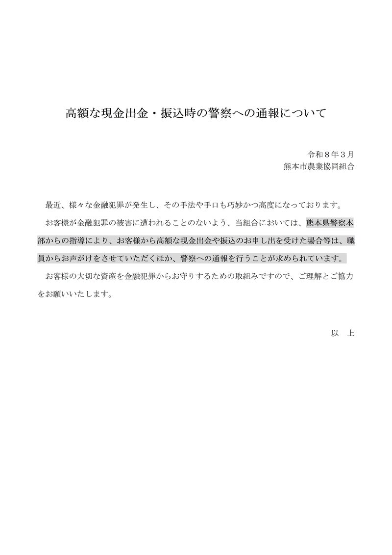 - 高額な現金出金・振込時の警察への通報について