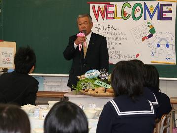 熊本市は1月15日、第1回学校給食「ひご野菜の日」交流会を同市出仲間の市立託麻中学校で開き、幸山政史市長らと生徒が会食して交流しました。